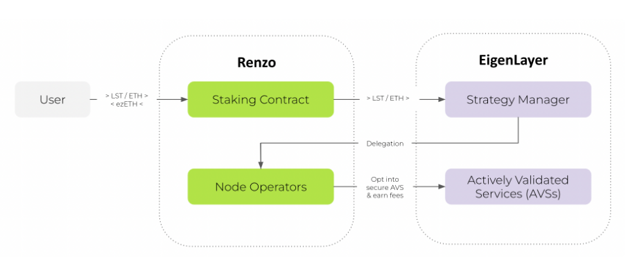 Renzo là một lớp được xây dựng trên EigenLayer vậy nên người dùng có thể loại bỏ sự phức tạp khi tương tác với giao thức. Smart contracts được thiết kế cho việc cho phép ủy quyền đến rất nhiều node Operator trên EigenLayer và người dùng cơ bản chỉ cần stake stETH, rETH, cbETH, ETH vào Renzo và để mint ra ezETH. ezETH là một Reward-bearing Token.