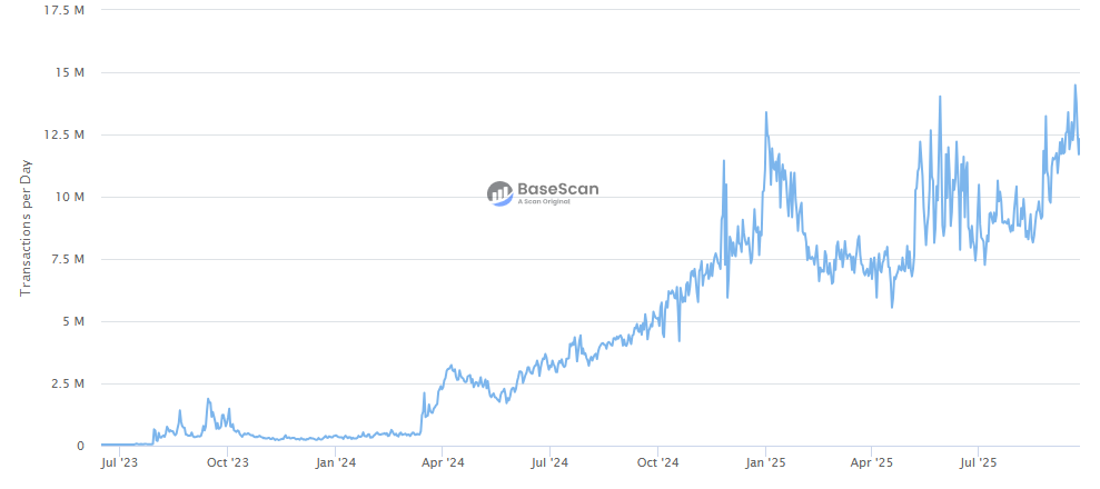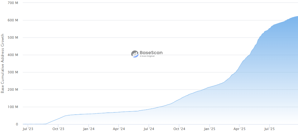 Base là một trong số ít Layer 2 giữ được sự tăng trưởng về lượng người dùng kể từ khi Mainnet. Tuy nhiên trong 6 tháng gần đây, sự tăng đã bị chậm lại đáng kể khi lượng người tăng trưởng hàng ngày chỉ dao động quanh mức 600k User, thấp hơn nhiều so với còn số hơn 2 triệu User vào đầu năm 2025. Nguyên nhân có lẽ đến một phần do Layer 2 không còn duy trì được sức hút như trước và cũng một phần do Base chưa có thêm một Narrative mới nào để thu hút người dùng.