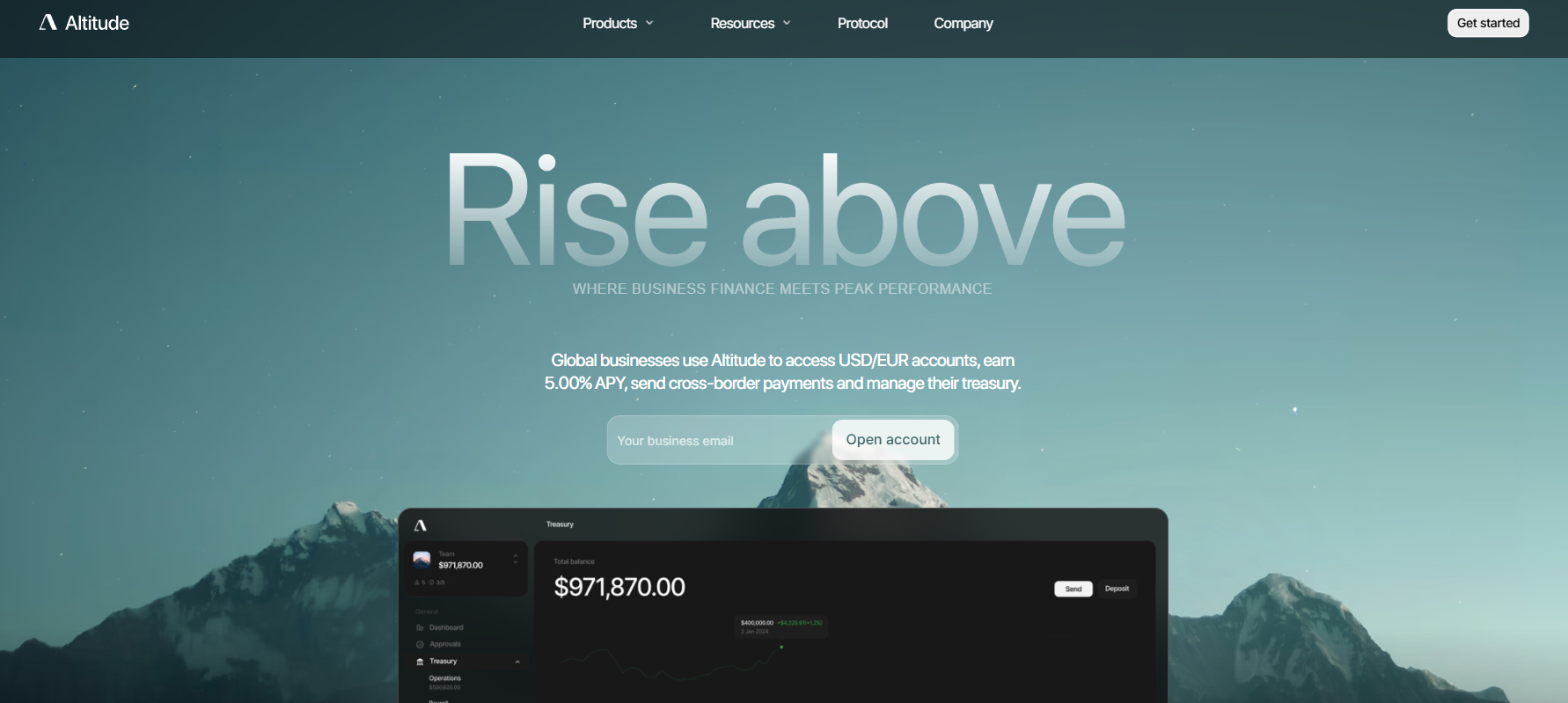 Altitude là nền tảng công nghệ tài chính Onchain dành cho doanh nghiệp toàn cầu, tập trung vào việc cung cấp dịch vụ tài chính mà không phải là ngân hàng. Nền tảng này cho phép doanh nghiệp ở hơn 150 quốc gia tiếp cận tài khoản USD và EUR, kiếm 5.00% APY qua Altitude Rewards, gửi thanh toán xuyên biên giới và quản lý kho bạc. Altitude sử dụng Stablecoins như USDC và EURC để thực hiện giao dịch, với quyền sở hữu trực tiếp và kiểm soát tài sản, giúp di chuyển tiền nhanh hơn và rẻ hơn.