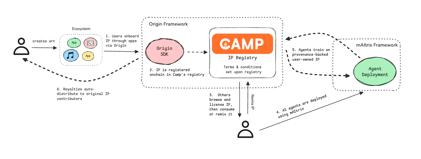- Triển Khai AI Agents qua mAItrix: mAItrix cho phép nhà sáng tạo triển khai AI Agents có thể huấn luyện trên IP đã đăng ký, đảm bảo Attribution minh bạch và sử dụng tuân thủ.