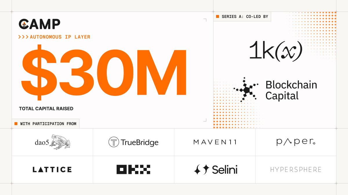 - 29/04/2025: Camp Network tiếp tục kêu gọi thành công $30M tại vòng Series A, đồng dẫn đầu bởi Blockchain Capital và 1kx, cùng sự tham gia của OKX Ventures, Paper Ventures và Lattice.