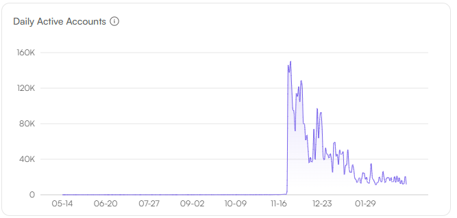 Đầu tiên chúng ta cùng xét về số lượng Transaction hàng ngày trên Monad. Có thể thấy con số này đạt đỉnh vào ngày 25/11/2025 với hơn 4.7 triệu Tx, đây cũng là thời điểm TGE của Monad điều này cho thấy sức hút cực kì lớn của dự án đối với cộng đồng. Tuy nhiên, sau đó Monad không duy trì được sự chú ý và số lượng Transactions hàng ngày cũng giảm mạnh, hiện chỉ dao động quanh mức 2 triệu Transactions