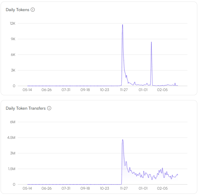 Về số lượng Token được tạo mới cũng như giao dịch hàng ngày trên hệ sinh thái Monad cũng không có gì khả quan hơn khi số lượng Token được tạo mới hàng ngày chỉ dạo động quanh mức hơn 100 Token, thấp hơn rất nhiều so với đỉnh điểm hơn 10k Token được tạo mới vào ngày 25/11/2025. Số lượng giao dịch Token hàng ngày trên Monad cũng không tốt hơn là bao với hơn 800.000 Tx so với mức đỉnh điểm hơn 4 triệu Tx