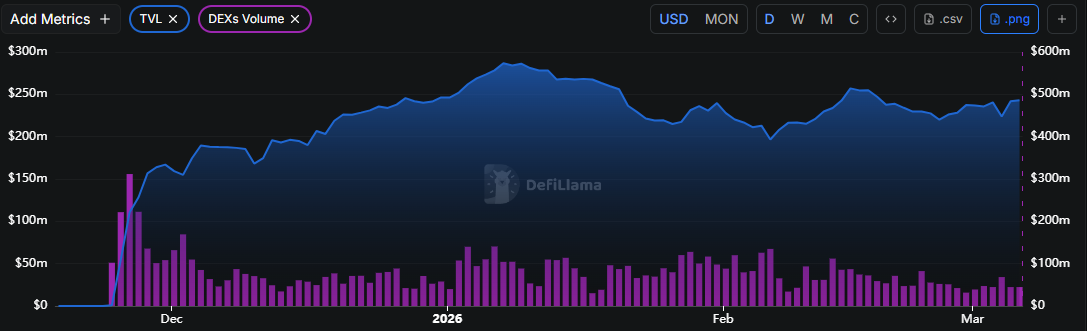 TVL có lẻ là chỉ số khả quan nhất ở thời điểm hiện tại khi vẫn giữ được sự tăng trưởng tốt kể từ thời điểm TGE với đỉnh điểm đạt 280 triệu USD vào ngày 07/01/2026 và hiện đã giảm nhẹ xuống mức 242 triệu USD. Điều này cho thấy dòng vốn đổ vào hệ sinh thái Monad vẫn được đảm bảo và chưa bị rút ra nhiều. Còn về khối lượng giao dịch hàng ngày trên Dex hiện đang giao động quanh mức 44 triệu USD, giảm khá sâu so với mức đỉnh điểm 300 triệu USD trong những ngày đầu TGE