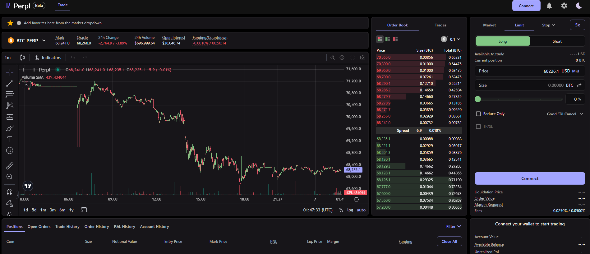 bên cạnh đó, PerplTrade cũng hướng đến việc mang lại trải nghiệm giao dịch tương đương như các sàn Cex nhưng vẫn giữ được tính phi tập trung hoàn toàn. Người dùng có thể giao dịch các tài sản như DogeCoin với đòn bẩy, tận dụng hiệu quả vốn và sử dụng các công cụ phân tích kỹ thuật nâng cao thông qua biểu đồ TradingView. Tuy nhiên để so sánh với các PerpDex đang có trên thị trường thì PerplTrade vẫn còn rất nhiều mặt hạn chế, điển hình là độ trượt giá cao cũng như UX chưa được mượt mà