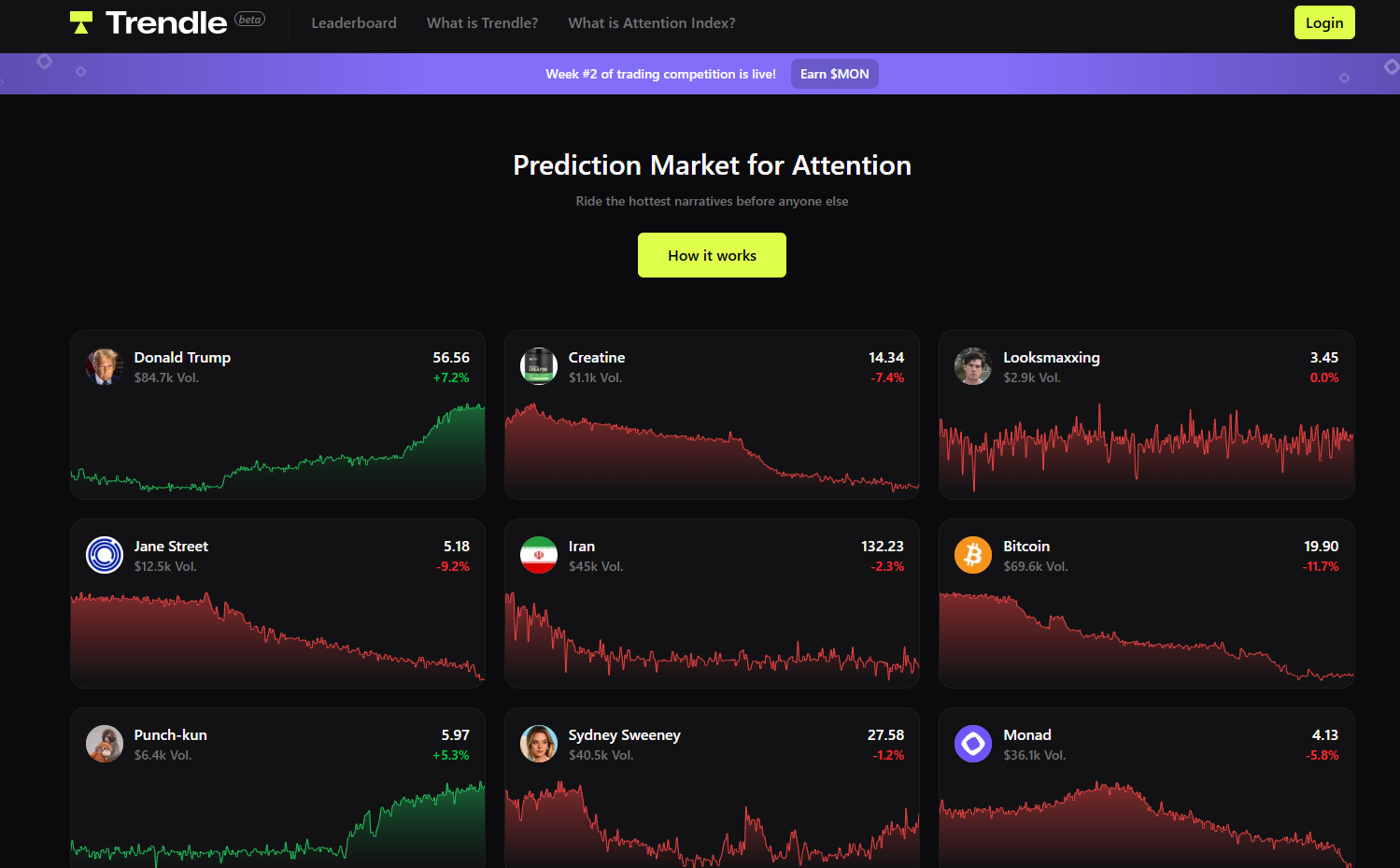 Trendle là một nền tảng thị trường dự đoán tập trung vào việc biến sự chú ý trực tuyến thành một loại tài sản tài chính mới gọi là AttentionFi. Thay vì dự đoán kết quả của một sự kiện như thắng hay thua thì người dùng có thể giao dịch dựa trên mức độ Hype, Sentiment và tương tác xoay quanh các chủ đề đang nóng như Narative Crypto, đội thể thao, người có sức ảnh hưởng hoặc sự kiện chính trị. Nền tảng thu thập dữ liệu Real Time từ các mạng xã hội như X, Reddit và Youtube để xây dựng Attention Index - một chỉ số phản ánh mức độ chú ý của cộng đồng và có thể giao dịch giống như một tài sản tài chính. Người dùng có thể Long khi Hype đang bùng nổ hoặc Short khi xu hướng dần hạ nhiệt, biến Meme, văn hóa Internet và các câu chuyện trên mạng xã hội thành các thị trường minh bạch và không cần tin cậy