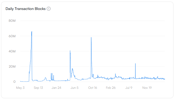Đầu tiên chúng ta cùng xét về số lượng Transactions hàng ngày trên Sui. Có thể thấy Sui là một trong số ít Blockchain vẫn duy trì được lượng Transactions hàng ngày ở mức cao ngay cả khi thị trường hiện đang rơi vào xu hướng giảm, hoạt động tương tác trong DeFi của người dùng cũng không sôi động như trước. Hiện tại có khoảng 8 - 10 triệu Transactions hàng ngày trên Sui, con số này tương đương với giai đoạn 2025 khi Sui là một trong những hệ sinh thái hoạt động nôi nổi nhất