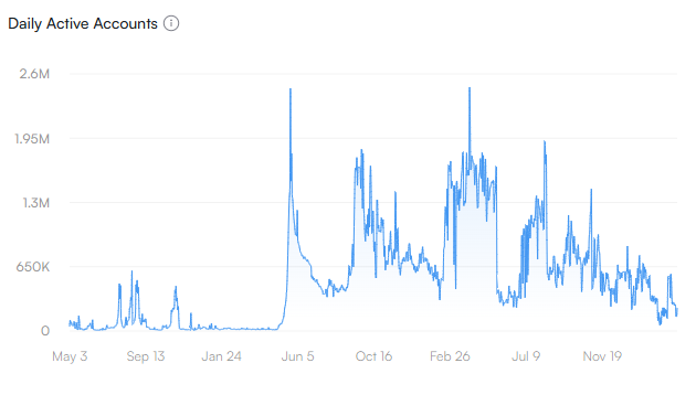 Tuy nhiên khi xét về số người dùng hoạt động hàng ngày trên hệ sinh thái trên Sui thì chúng ta lại thấy sự suy giảm rõ rệt so với giai đoạn giữa năm ngoài. Hiện số người dùng hoạt động hàng ngày trên Sui chỉ dao động quanh mức 150 - 200k người, thấp hơn khá nhiều so với 700 - 1 triệu người hoạt động hàng ngày trong giai đoạn giữa năm 2025