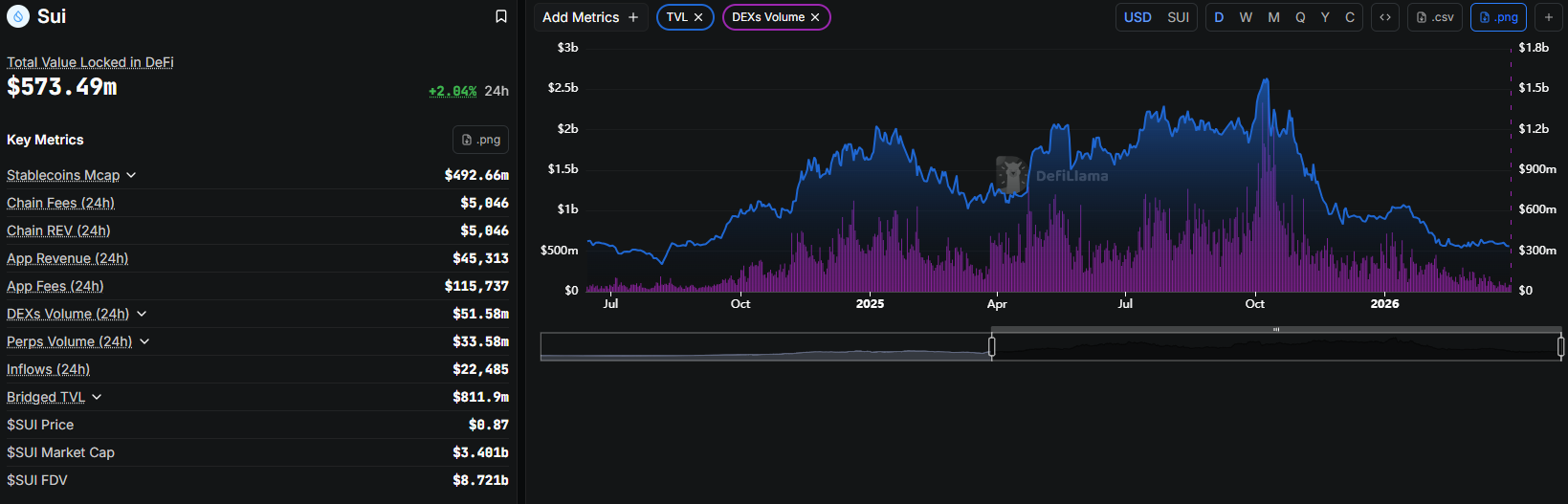 Tiếp theo, nếu xét về TVL thì Sui cũng chứng kiến sự sụt giảm rõ rệt. Từ mức đỉnh hơn 2.5 tỷ USD vào tháng 10/2025 thì đã giảm xuống còn hơn 500 triệu USD ở thời điểm hiện tại. Khối lượng giao dịch hàng ngày trên Sui cũng chứng kiến viễn cảnh tương tự, hiện chỉ khoảng 30 - 40 triệu USD thấp hơn rất nhiều so với giai đoạn đỉnh điểm nơi hệ sinh thái Sui đạt hơn 1 tỷ USD khối lượng giao dịch hàng ngày