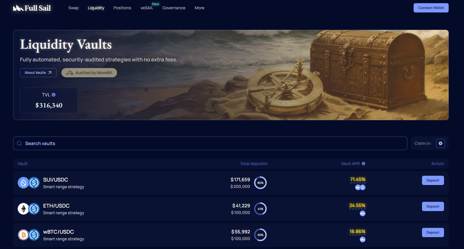 Trong thời gian gần đây, họ đã ra mắt Vault nhằm giải quyết vấn đề khó khăn khi cung cấp thanh khoản nơi người dùng phải thay đổi chiến lược liên tục để phù hợp với độ biến động trên thị trường. Đối với Vault trên Full Sail thì người dùng chỉ cần Deposit tiền vào và các chiến lược sẽ được vận hành 1 cách tự động. Hiện tại mức APR của các Pool như SUI/USDC đang là tương đối cao lên tới 71% 1 năm hay ETH/USDC cũng lên tới 24%/ 1 năm
