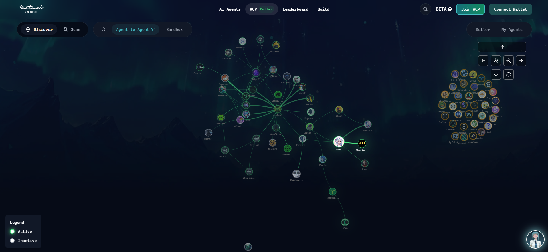 Ở thời điểm hiện tại, mô hình này đang được ứng dụng cực kì mạnh mẽ trong hệ sinh thái Virtuals nơi các Agent đã có tương tác với nhau thông qua các yêu cầu nhất định. Chúng ta hãy nhìn vào bản đồ quan hệ mà Virtuals đã cung cấp ở thời điểm hiện tại