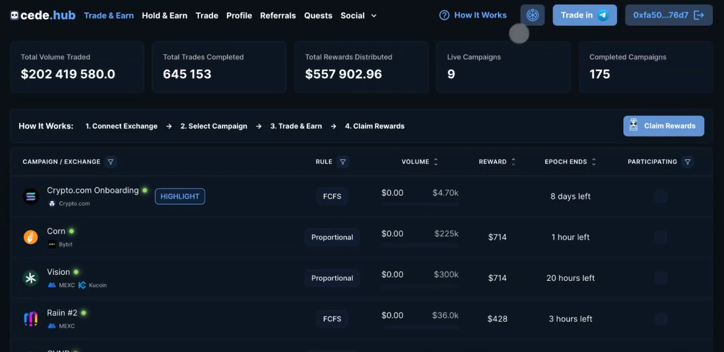 Từ tháng 11 năm 2024 đến tháng 10 năm 2025, Cede Hub đã tổ chức hơn 180 cuộc thi giao dịch và nắm giữ, tạo ra hơn 730 triệu USD khối lượng giao dịch và phân phối hơn 1.7 triệu USD phần thưởng cho cộng đồng của Cede Hub.