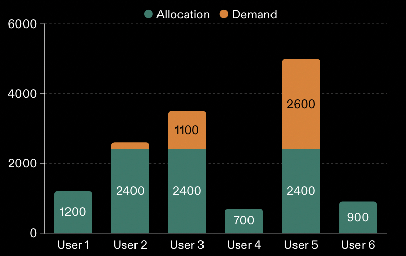 Tại thời điểm này, tất cả những người còn lại đều có nhu cầu mua cao hơn 2.400 USD, vì vậy mức 2.400 USD được xác định là mức phân bổ cuối cùng cho phần nhu cầu còn lại. Theo đó, Người dùng 2, Người dùng 3 và Người dùng 5 mỗi người sẽ nhận được 2.400 USD giá trị Token. Kết quả cuối cùng là tất cả người tham gia đều nhận được ít nhất mức phân bổ tối thiểu.