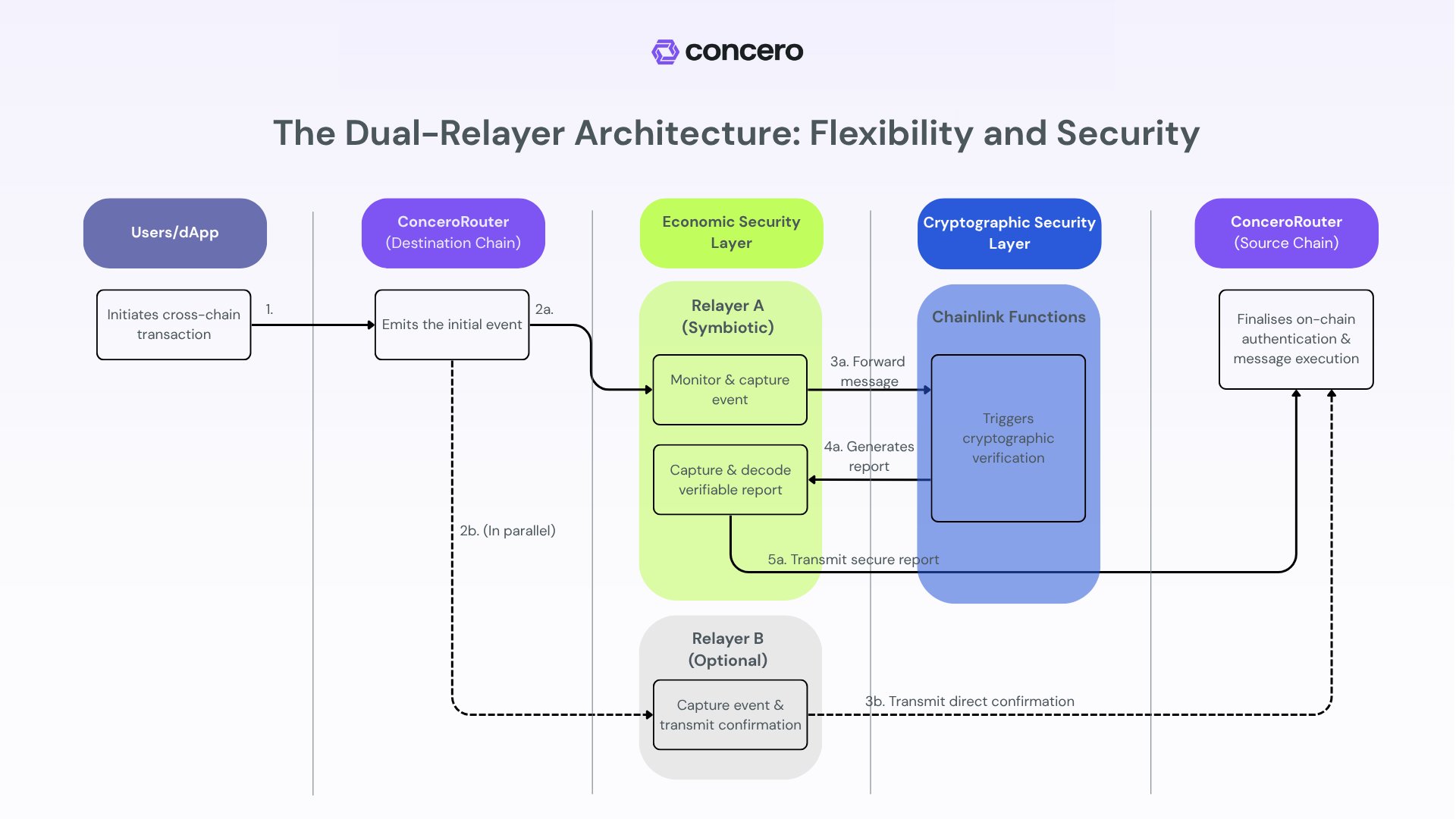 Concero V2 được xây dựng với kiến trúc Dual Relayer, cho phép xử lý nhiều loại thông điệp Cross Chain khác nhau một cách tối ưu và an toàn.