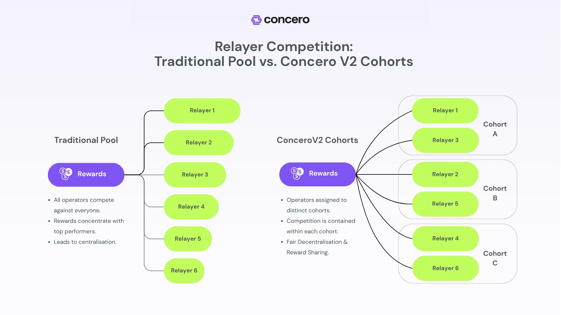 Một điểm đổi mới quan trọng trong Concero V2 là việc tổ chức các Relayer theo nhóm Cohort. Thay vì để tất cả Relayer cạnh tranh trực tiếp trong một nhóm chung, giao thức sẽ phân chia thành các Cohort độc lập theo thuật toán.