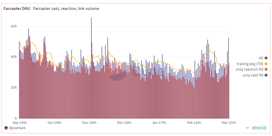 Rõ ràng ở thời điểm hiện tại, thị trường Crypto rất đa dạng các dự án và sự cạnh tranh người dùng giữa các dự án là cực kì gắt gao. Farcaster hiểu rằng nếu chỉ phát triển theo hướng bình thường thì rất khó để thu hút và giữ chân người dùng. Điều này đã được thể hiện thông qua các thông số onchain sau: