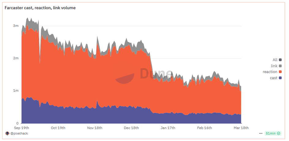 Mặc dù lượng người dùng hoạt động hàng ngày không bị tụt giảm quá sâu nhưng nếu nhìn sang các thông số về Farcaster Cast, Reaction hay Link thì đã có sự sụt giảm rõ rệt. Điều này cho thấy Farcaster đã mất dần sức hút và việc ra mắt Farcaster Airdrop là một cứu cánh giải quyết tình trạng này.