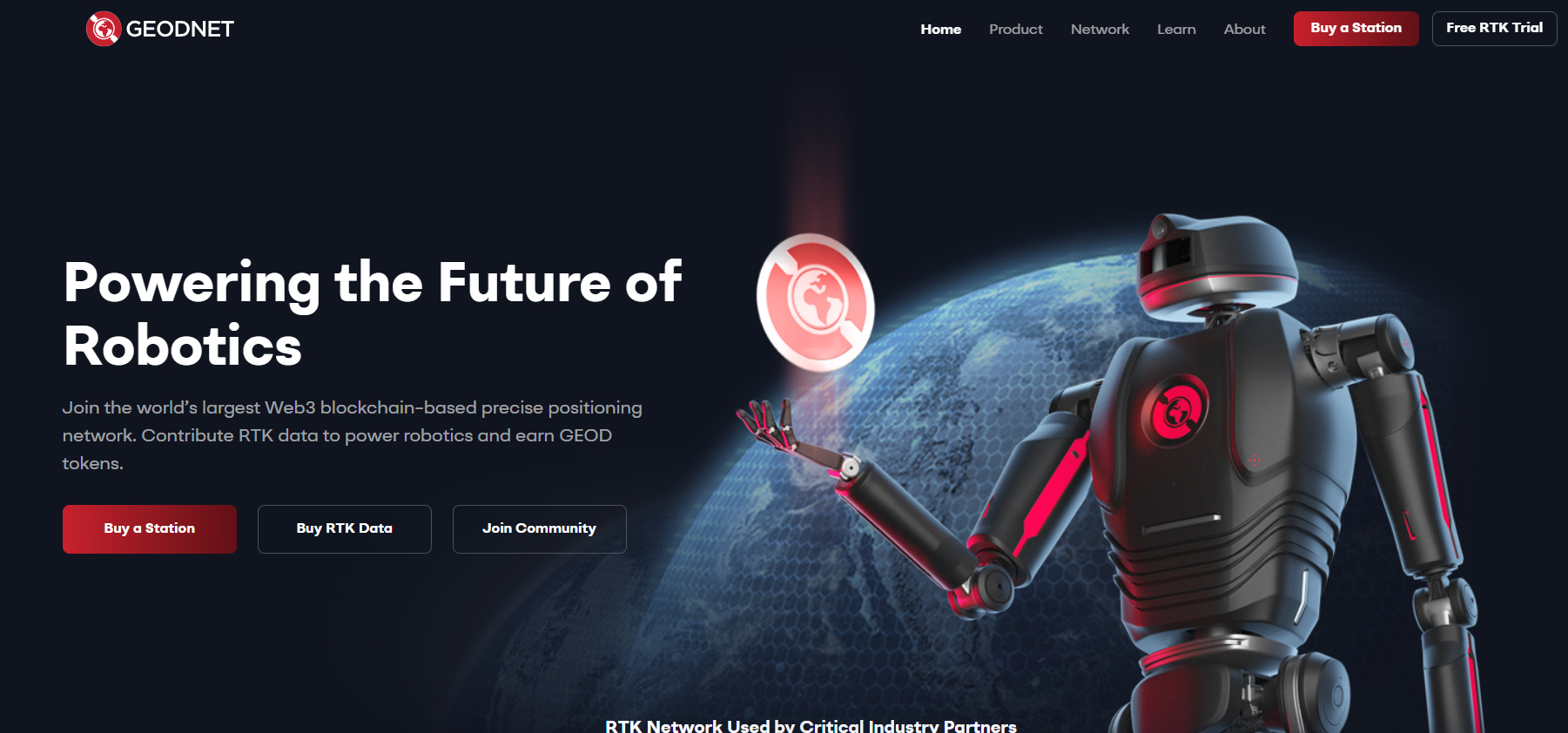 Geodnet là dự án DePIN tập trung vào việc cung cấp dữ liệu Real-time Kinematic (RTK) để hỗ trợ Robotics và các ứng dụng khác. Dự án cho phép người dùng đóng góp dữ liệu từ các trạm tham chiếu vệ tinh, đồng thời hỗ trợ các lĩnh vực như Robot thông minh nhân tạo, Drone, xe tự lái, thực tế ảo tăng cường và Metaverse. Mạng lưới đang phát triển với các chỉ số như số lượng Miner, quốc gia phủ sóng, lượng dữ liệu RTK sử dụng và doanh thu hàng năm, dù các con số cụ thể trong dữ liệu hiện tại được ghi nhận là 0.