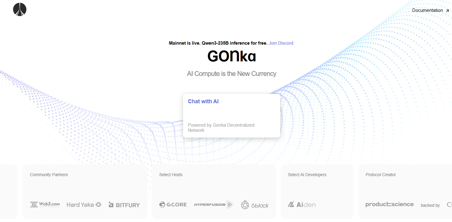 Dự án cung cấp tính năng Chat với AI được hỗ trợ bởi Gonka Decentralized Network. Dự án nhấn mạnh tài nguyên tính toán AI được coi như một loại tài sản kỹ thuật số có giá trị trao đổi trong hệ sinh thái Blockchain.