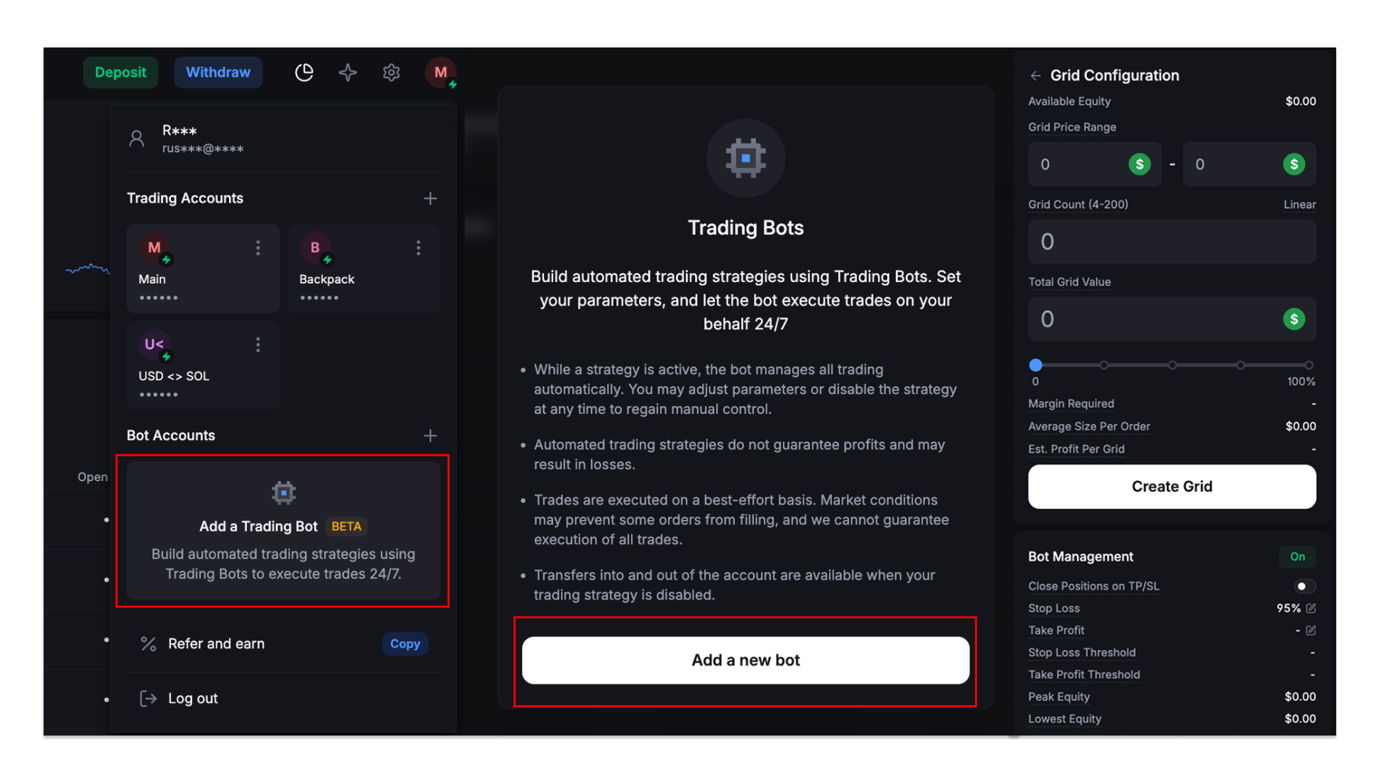Khi đã bật thành công, mở mục Trading Bots từ menu chính và chọn Create New Grid Bot để bắt đầu tạo chiến lược. Tại giao diện cấu hình, người dùng sẽ thiết lập các thông số quan trọng như biên độ giá giao dịch, số lượng Grid, tổng vốn phân bổ cho chiến lược và kích thước lệnh trung bình ở mỗi mức Grid.