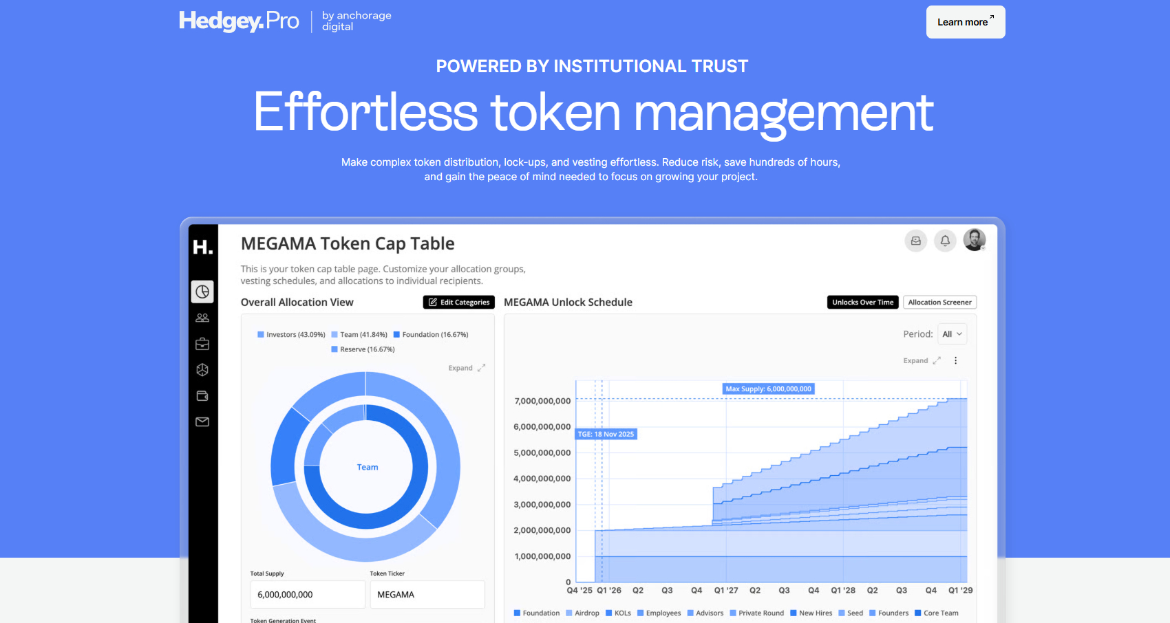 - Tích hợp Custody tổ chức (Hedgey Pro): Kết hợp với Anchorage Digital để cung cấp quản lý Token cấp tổ chức, bao gồm bảo mật cao, tuân thủ quy định và hỗ trợ toàn diện Cap Table, dành cho các dự án lớn cần độ tin cậy Institutional-grade.