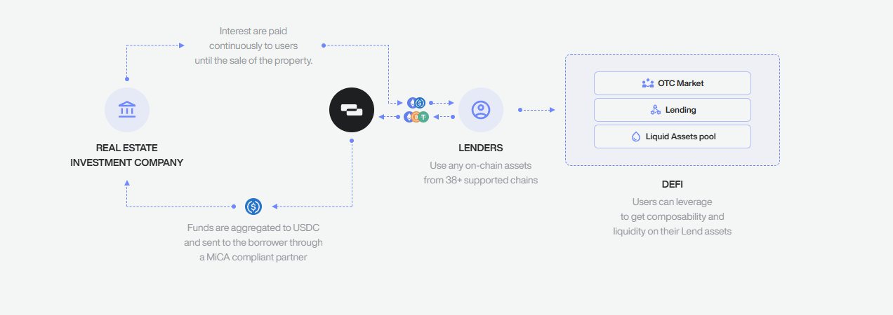 - Bước 3: USDC đã tổng hợp được chuyển qua đối tác tuân thủ MiCA, sau đó gửi đến công ty đầu tư bất động sản để tài trợ trực tiếp cho dự án thực tế, đảm bảo toàn bộ quy trình Off-chain tuân thủ quy định châu Âu và được nộp hồ sơ chi tiết với AMF cho từng dự án.