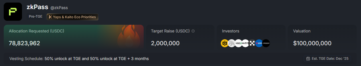 ZkPass sẽ được mở bán trên Kaito Launchpad bắt đầu từ ngày 27/10/2025 và kết thúc vào ngày 03/11/2025 với mục tiêu gọi vốn là 2 triệu USD với FDV ở mức 100 triệu USD. Mức đầu tư tối thiểu được ghi nhận là 1000 USD và tối đa là 250.000 USD và như thường lệ người tham gia phải hoàn thành KYC, nạp USDC vào ví để tham gia. Dự kiến ZkPass sẽ TGE vào tháng 12/2025 và phần phân bổ cho người tham gia Sale được Unlock 50% ngay tại TGE và 50% còn lại sẽ được Unlock dần trong 3 tháng tiếp theo.