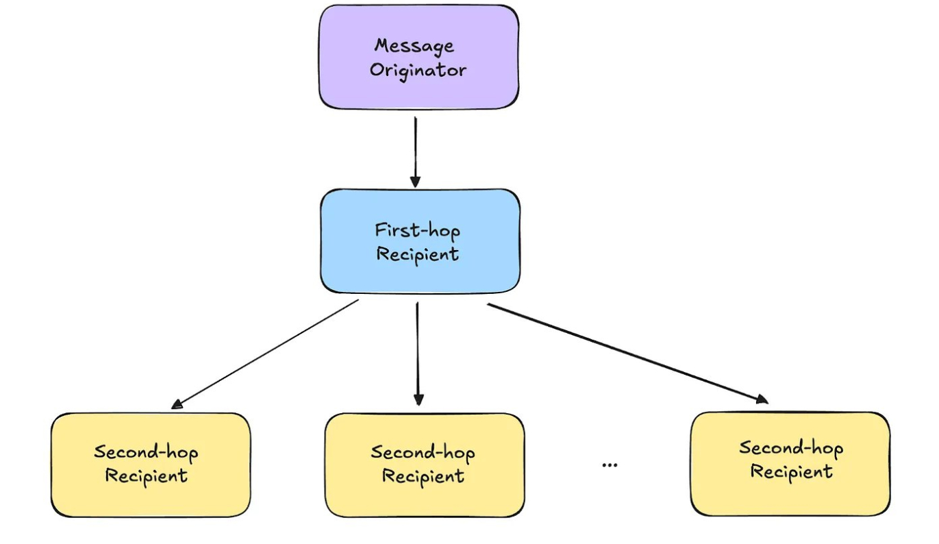 - RaptorCast: Việc truyền tải Block Proposal một cách hiệu quả đến toàn bộ Validator trong mạng là yếu tố then chốt đối với một mạng có băng thông cao như Monad. RaptorCast được thiết kế dành riêng cho MonadBFT để giải quyết vấn đề này. Đây là một giao thức truyền tải thông điệp chuyên biệt, trong đó Block Proposal được chuyển thành các mảnh nhỏ bằng Erasure Coding — quá trình này được thực hiện bởi Leader. Mỗi mảnh dữ liệu được gửi qua cấu trúc Two-Level Broadcast Tree, trong đó tầng một (First-hop) là các Node không phải Leader được phân bổ số lượng mảnh tương ứng với Stake Weight, và các Node này tiếp tục chuyển dữ liệu đến tầng hai (Second-hop). Cách tiếp cận này giúp giảm đáng kể độ trễ mà Validator phải chịu khi nhận Block Proposal, từ đó tăng tốc quá trình đạt Consensus về thứ tự Transaction.
