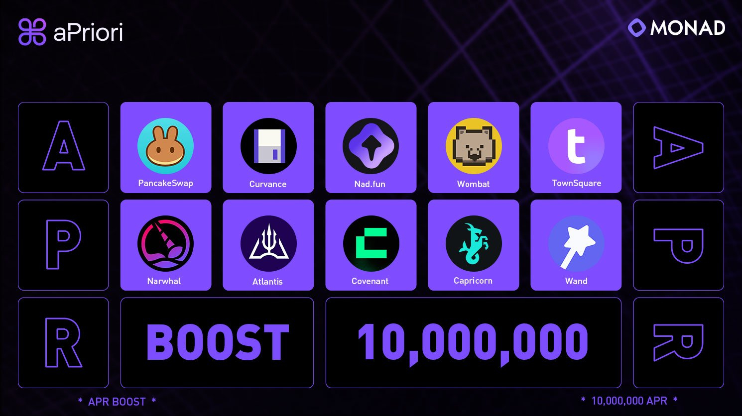 aPriori là giao thức Liquid Staking nổi tiếng nhất trong hệ sinh thái Monad. Người dùng có thể Stake MON và nhận về aprMON, một Liquid Staking Token. aprMON không chỉ phản ánh phần thưởng Staking PoS thông thường mà còn bao gồm cả doanh thu MEV được tạo ra từ mạng lưới và phân phối lại cho người dùng. Hiện tại dự án đang triển khai APR Boost Season 1 với phân bổ 10.000.000 Token APR dựa trên mức sử dụng trong hơn 2 tháng, 65% được phân phối cho người dùng trực tiếp tương tác với sản phẩm của aPriori theo một công thức cố định và minh bạch (dashboard cập nhật hằng ngày sẽ ra mắt trong tuần này), trong khi 35% còn lại được phân bổ cho các đối tác hệ sinh thái để tiếp tục phân phối cho người dùng thông qua bốn đợt kéo dài 15 ngày.
