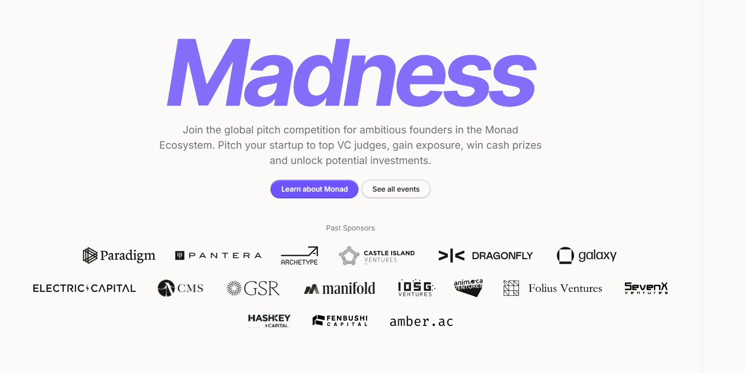 Monad Madness là một cuộc thi Pitch dành cho các Nhà Phát Triển và Startup trên toàn thế giới, được thiết kế nhằm tìm kiếm và hỗ trợ những dự án đổi mới sáng tạo trong hệ sinh thái Monad. Cuộc thi sở hữu quỹ giải thưởng lên đến $1M và thông qua quan hệ đối tác với nhiều quỹ Đầu Tư Mạo Hiểm, còn cung cấp cơ hội nhận tới $60M vốn đầu tư tiềm năng. Monad Madness đã được tổ chức tại New York, Bangkok và Hong Kong với 3 dự án đã thắng giải ở mỗi sự kiện như sau: