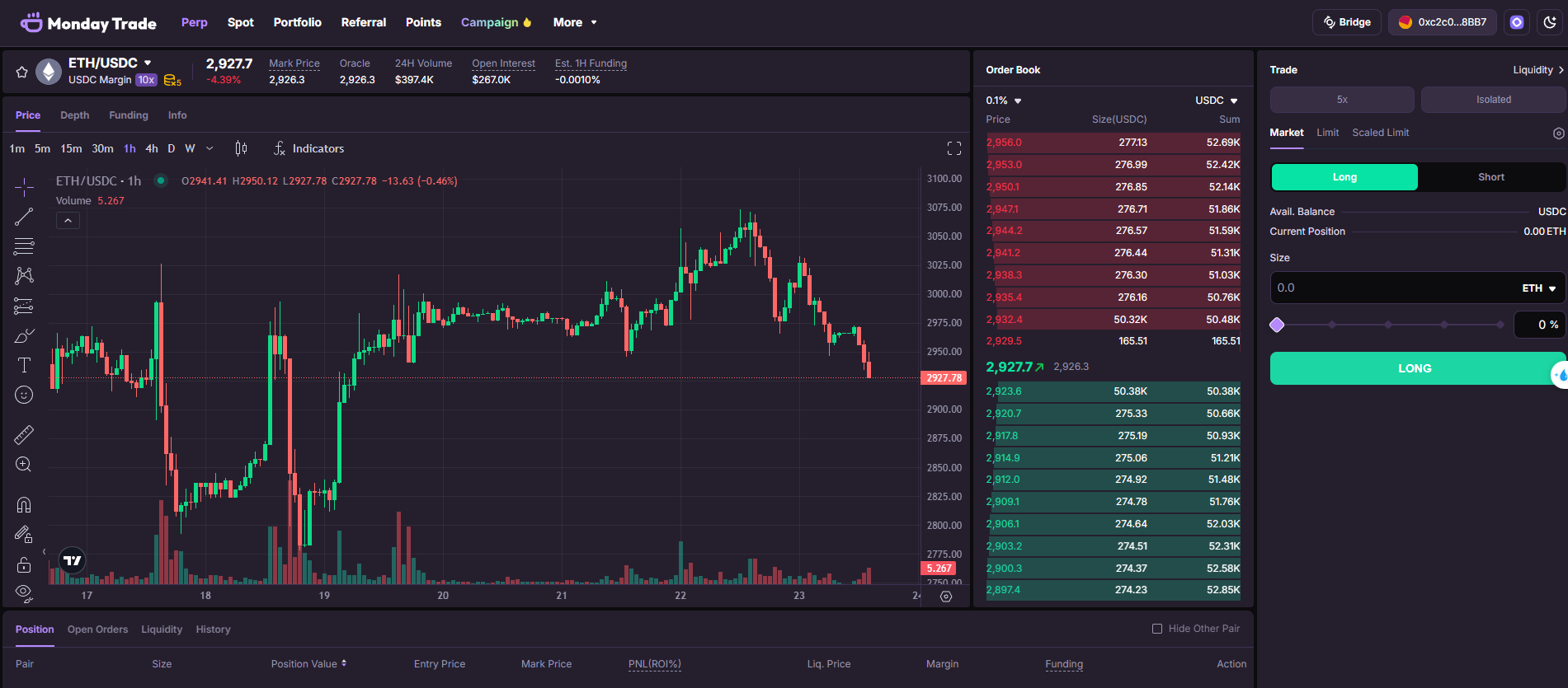 Dự án tập trung mang đến trải nghiệm giao dịch tương đương CEX nhưng giữ tính phi tập trung hoàn toàn, với quyền kiểm soát tài sản thuộc về người dùng. Monday Trade hỗ trợ tạo Pool thanh khoản Permissionless kết hợp với các chương trình Incentive như Voyage Point Program và các Campaign thưởng để khuyến khích Trading và cung cấp thanh khoản.