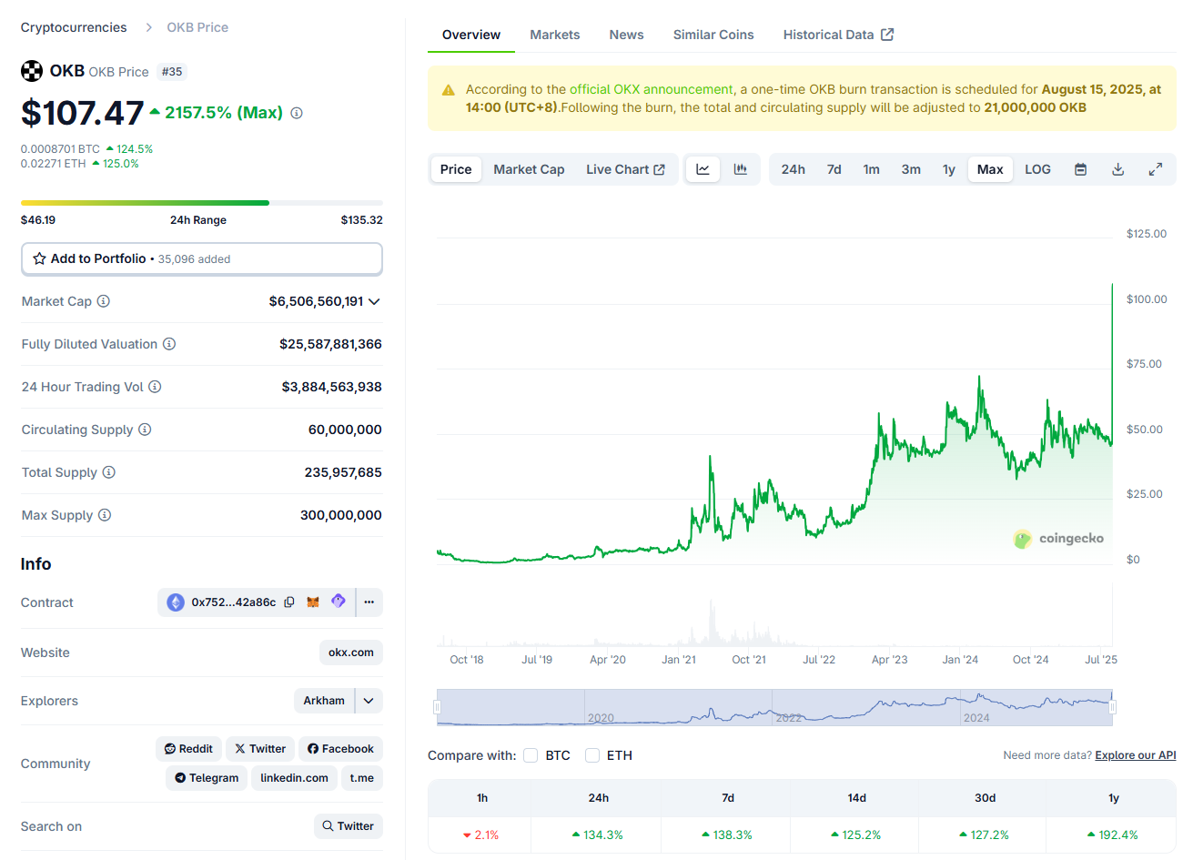 - Burn nguồn cung lịch sử: Đốt 65.256.712 OKB từ mua lại lịch sử và kho dự trữ; sau burn, tổng cung cố định ở mức 21 triệu OKB.