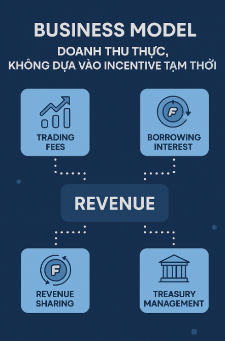 Một trong những điểm tạo nên sự khác biệt rõ rệt của Fluid so với các giao thức DeFi truyền thống là mô hình kinh doanh không phụ thuộc vào Liquidity Mining lạm phát. Thay vì phát token để thu hút dòng tiền ngắn hạn, Fluid tập trung tạo ra doanh thu từ hoạt động thực của giao thức từ các nguôn sau: