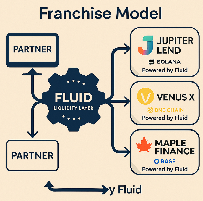 Một trong những điểm độc đáo nhất tạo nên sự khác biệt của Fluid so với phần lớn các giao thức DeFi hiện nay chính là mô hình nhượng quyền công nghệ. Thay vì tự mình triển khai trên nhiều Blockchain khác nhau rồi dần dần xây dựng cộng đồng và thu hút người dùng mới – cách làm quen thuộc của hầu hết sản phẩm DeFi thì Fluid chọn một chiến lược hoàn toàn khác: cấp quyền sử dụng công nghệ cốt lõi của mình cho các giao thức lớn tại từng hệ sinh thái. Điều này cho phép Fluid mở rộng nhanh hơn, hiệu quả hơn và ít rủi ro hơn so với mô hình tự đi mở rộng truyền thống
