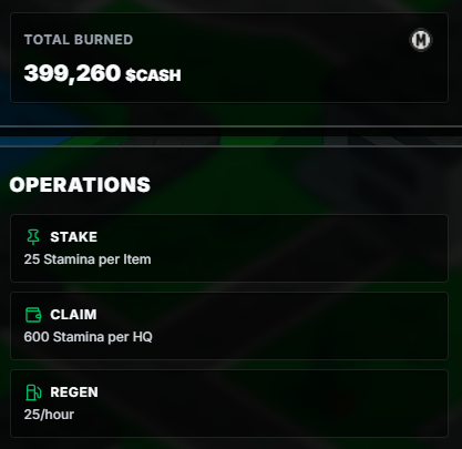 - NFT Yield Items: Bao gồm 3 loại Street Hustler (Entry Level, Low Risk), Gang Leader (Mid Tier, Balanced) và Mafia Boss (High Tier, High Tisk/High Return). Các NFT này tạo ra dòng thu nhập thụ động dưới dạng CASH khi được triển khai trong Headquarters. Mỗi NFT có thể nâng cấp lên Level 5 với mỗi cấp tăng phần trăm lợi nhuận khác nhau: Street Hustler: +2% mỗi cấp, Gang Leader: +5.5% mỗi cấp và Mafia Boss: +10% mỗi cấp