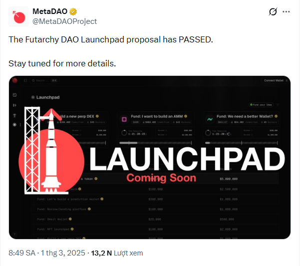 Tháng 03/2025 là thời điểm MetaDAO bước vào giai đoạn chuyển mình. Một proposal quan trọng được đưa lên MetaDAO nhằm mở rộng nền tảng Futarchy sang Fundraising tức biến MetaDAO thành một Launchpad ứng dụng Futarchy để quản trị quá trình ICO và Treasury sau ICO. Proposal này được thông qua với sự ủng hộ mạnh mẽ, đánh dấu sự thay đổi chiến lược lớn nhất trong lịch sử MetaDAO.