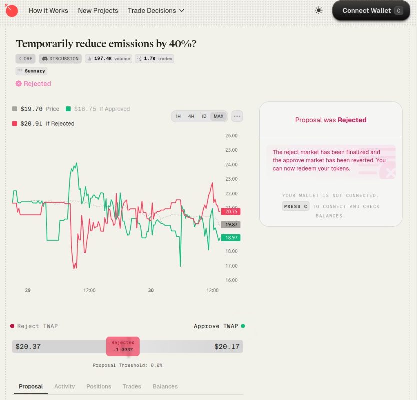 Cơ chế hoạt động rất trực quan: mỗi Proposal sẽ có hai thị trường tương ứng cho hai kết quả PASS và FAIL. Trader có thể mua bán token đại diện cho hai Outcome này. Nếu thị trường đánh giá rằng việc thực thi Proposal sẽ làm tăng giá trị token của dự án PASS Market sẽ giao dịch ở mức cao hơn FAIL Market và ngược lại. MetaDAO sử dụng một cơ chế kỹ thuật gọi là Lagged Price TWAP để tính giá, nhằm hạn chế tối đa khả năng bị thao túng trong thời gian ngắn.