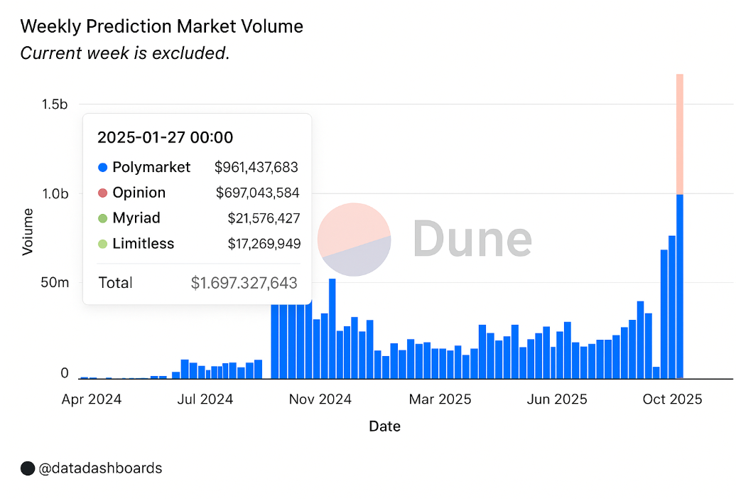 Mặc dù mới chỉ ra mắt được vài ngày nhưng Opinion đã ngay lập tức thể hiện được chỗ đứng của mình trên thị trường khi đạt khối lượng giao dịch lên tới gần 750 triệu USD trong tuần gần nhất và chỉ thua kém Polymarket với 1.1 tỉ USD và Kalshi với 1.2 tỉ USD. Con số này thực sự làm mình bất ngờ vì so với 2 cái tên cộm cán trên đã xây dựng được một thời gian dài và có một lượng người dùng đông đảo thì Opinion là một cái tên hoàn toàn mới nhưng lại tạo ra một khối lượng giao dịch cực kì khủng khiếp.