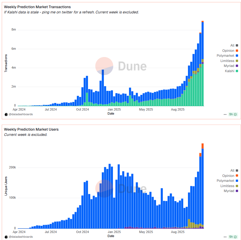 Đi sâu vào các dữ liệu tiếp theo, về số lượng người dùng thì Polymarket hiện đang có tới hơn 250000 User hàng tuần trong khi con số này đối với Opinion chỉ là gần 17000 User. Về số lượng Transaction thì Polymarket đạt gần 4 triệu Transactions hàng tuần trong khi Opinions chỉ đạt quanh 130.000 Transaction.