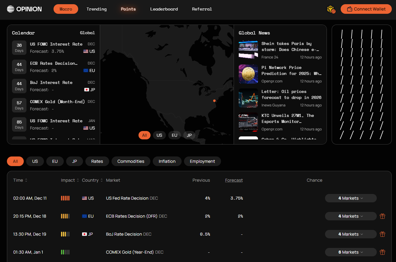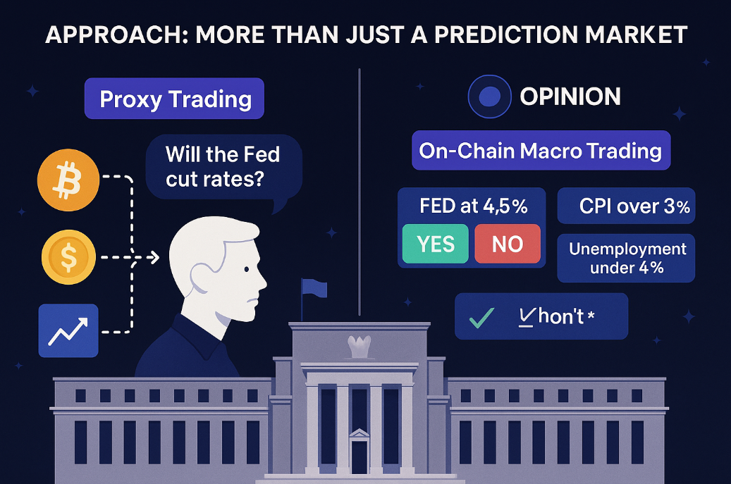 Opinion giải quyết vấn đề này bằng cách cho phép người dùng giao dịch trực tiếp các biến số kinh tế chẳng hạn như Fed sẽ giữ nguyên lãi suất?, CPI tháng tới tăng trên 3%? hay Tỷ lệ thất nghiệp Mỹ giảm dưới 4%?. Các hợp đồng này được xây dựng như tài sản chuẩn hóa và giao dịch trên một sàn CLOB On-chain, mang lại thanh khoản, tính minh bạch và hiệu suất cao.