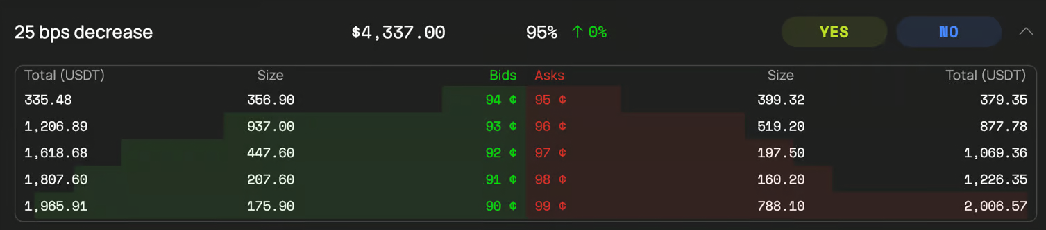 Tương tự với Polymarket, giá của mỗi hợp đồng phản ánh xác suất xảy ra của một sự kiện. Ví dụ, nếu “Yes” được giao dịch ở mức 65 Cent trong câu hỏi “Fed sẽ giữ nguyên lãi suất?” điều đó ngụ ý rằng thị trường định giá khả năng giữ nguyên là 65%. Ngược lại, “No” ở mức 35 cent thể hiện 35% xác suất cho kịch bản tăng hoặc giảm lãi suất.