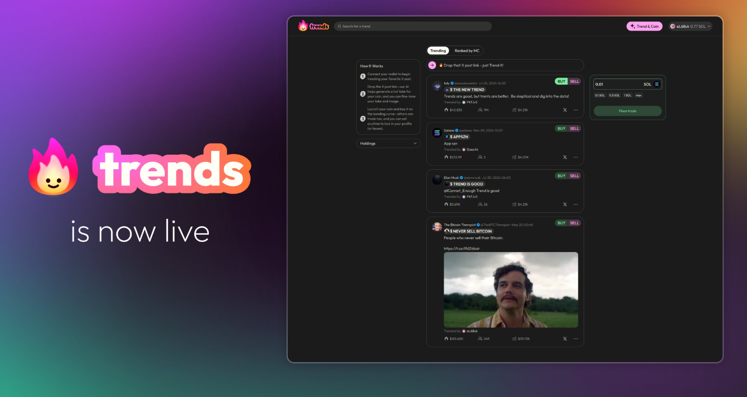 Trends.fun là một giao thức xã hội dựa trên giá trị, cho phép người dùng chọn các bài Post trên X mà họ cho là có giá trị sau đó token hóa chúng để trở thành 1 Trend thông qua cơ chế Bonding Curve. Điều này tạo ra một nguồn cấp dữ liệu chất lượng cao, được quản lí một cách phi tập trung nơi giá trị của token phụ thuộc vào sự đồng thuận của cộng đồng chứ không chỉ phụ thuộc vào dữ liệu của bài đăng gốc.