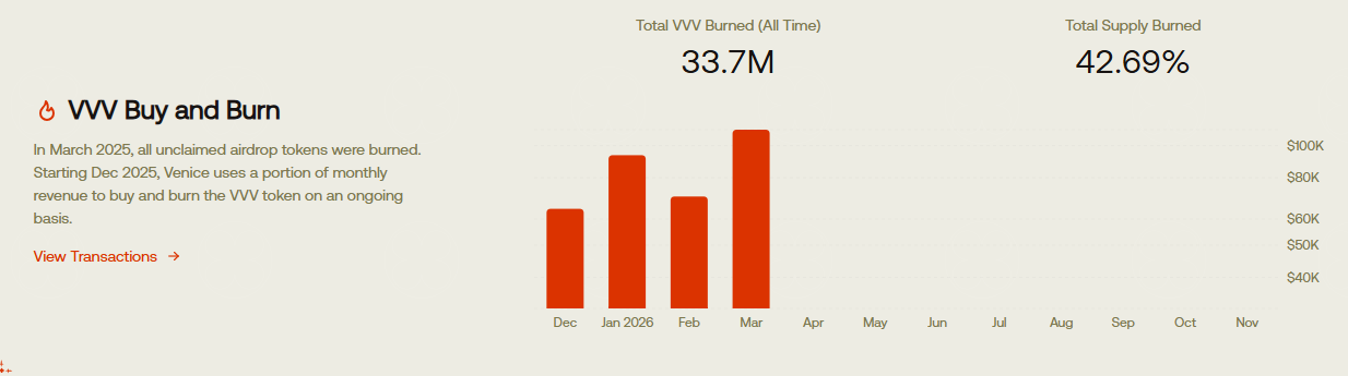 Còn đối với Token VVV, người dùng có thể Burn DIEM để đổi lấy VVV theo một mức Rate nhất định vì vậy khi DIEM tăng giá sẽ kéo theo VVV tăng giá. Tuy nhiên sẽ không tăng theo cùng 1 tỉ lệ vì người dùng chỉ Burn để đổi lấy VVV để Arbitrage chứ dùng để quản trị hay nhận doanh thu từ dự án thì ở thời điểm hiện tại vẫn chưa hấp dẫn. Nhu cầu sở hữu DIEM để Staking kiếm API Credit thì người dùng hoàn toàn có thể Swap từ Token khác trên Dex Aerodrome. Vì vậy, theo mô hình này thì khi nhu cầu người dùng cao token DIEM có động lực tăng giá mạnh mẽ hơn còn VVV sẽ có giá trị hơn về giai đoạn sau. Đặc biệt khi dự án đã công bố Buy Back and Burn tới hơn 42% tổng cung của Token VVV. Khi đó sự khan hiếm của VVV ngày càng hiện rõ và nó cũng ảnh hưởng đến DIEM nhờ tổng cung cố định và cơ chế Mint/Burn sang VVV. Nhờ vậy, Venice đang triển khai được mô hình Tokenomics tương đối hay với cơ chế Dual Token giảm phát