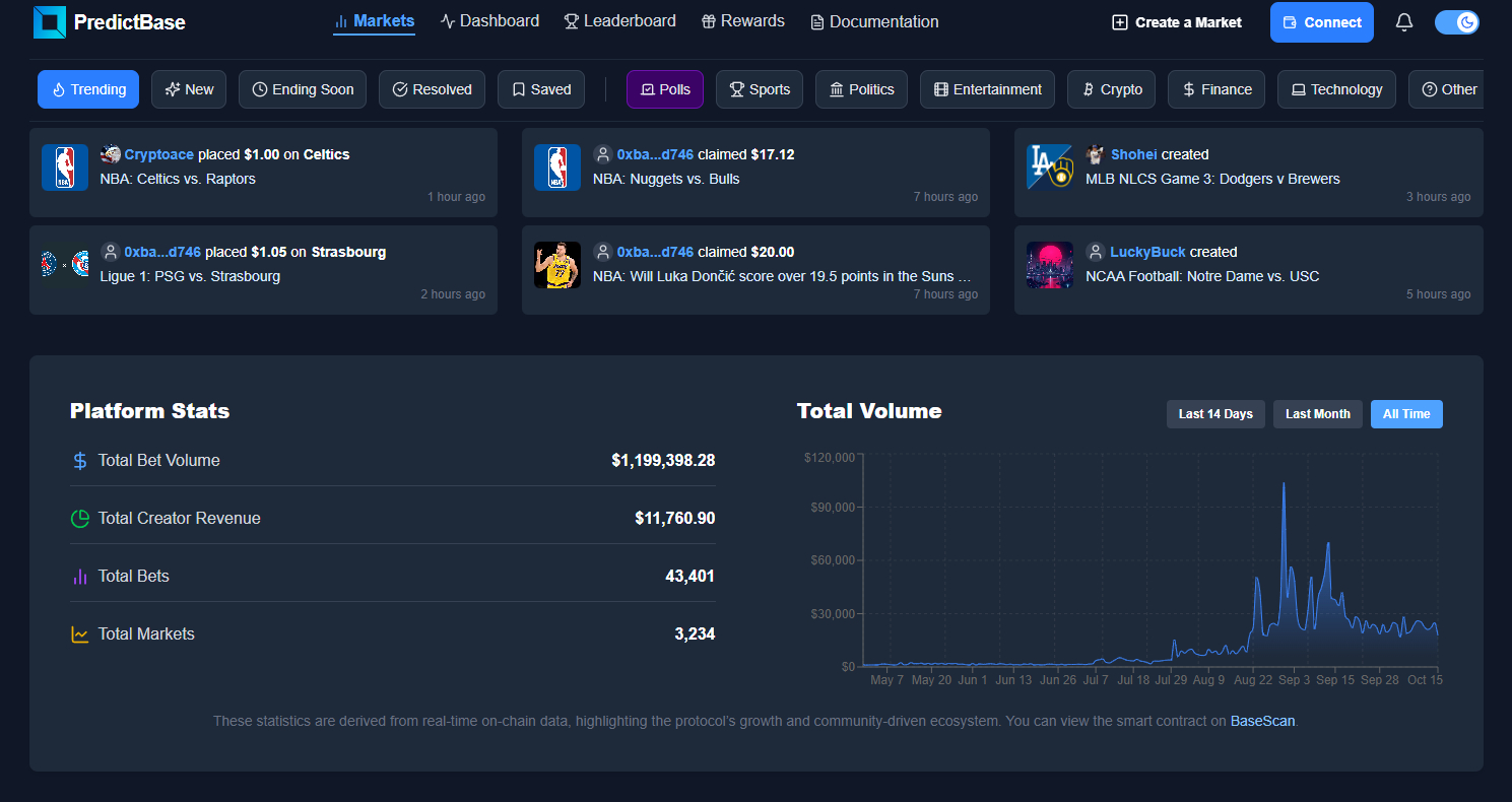 PredictBase là một nền tảng Prediction Market xây dựng trên Base, nơi người dùng có thể tạo thị trường về các sự kiện thực tế và đặt cược bằng USDC. Nền tảng này hoạt động không cần cấp phép, minh bạch và do cộng đồng dẫn dắt, với các Smart Contract xử lý tất cả các hoạt động cốt lõi.