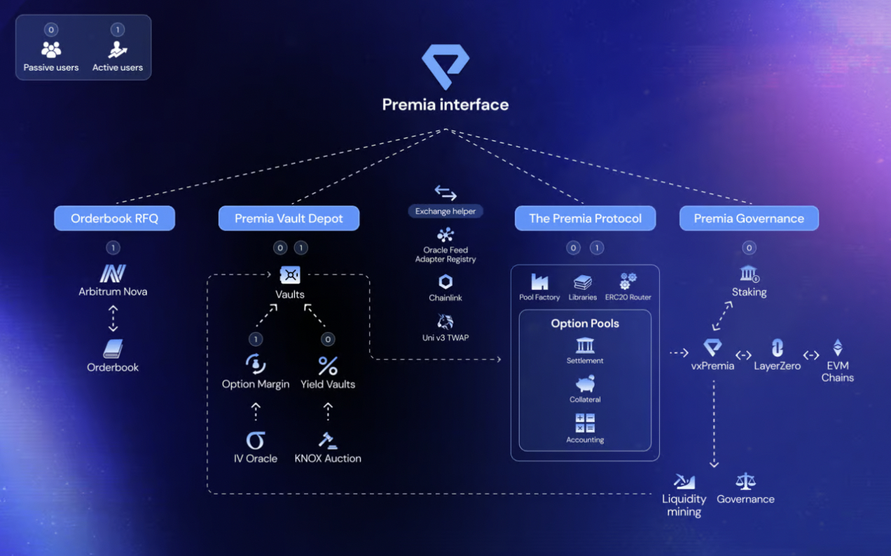 Premia Protocol là bộ Smart Contract có thể nâng cấp, cho phép tạo lập thị trường ngang hàng (peer-to-peer) và giao dịch Options trên các token ERC-20 hoạt động trên Blockchain Ethereum, đi kèm một settlement engine. Đây có thể xem như lớp nền tảng “base layer”. Premia Blue (v3) là một sàn giao dịch Options non-custodial, hỗ trợ range order tùy chỉnh hoàn toàn, pool permissionless, options vault, OTC liquidity và limit orderbook.