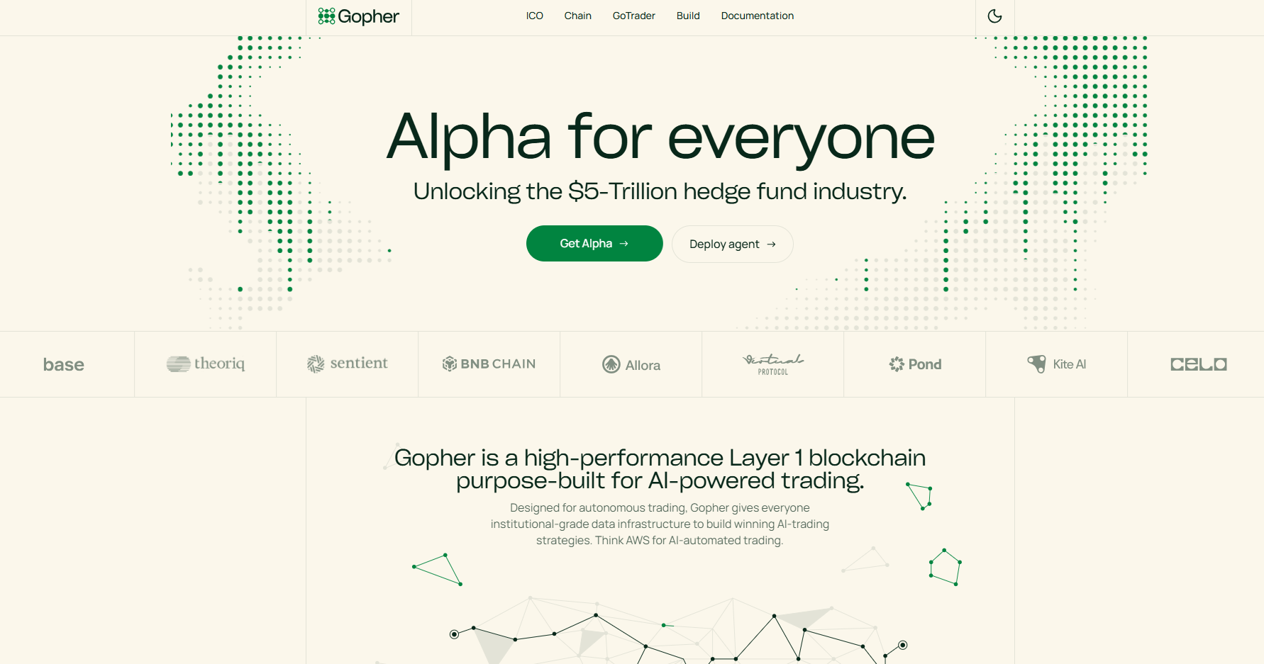 Gopher định vị như một mạng Layer 1 chuyên dụng cho Autonomous Trading nơi người dùng có thể xây, Deploy và Scale AI Trading Strategies dựa trên 3 lớp năng lực: Cogito Agent Framework, Trustworthy Data và Emissions. Trên trang giới thiệu, Gopher so sánh hướng tiếp cận như Aws cho AI Automated Trading, nhấn mạnh vào Data Infrastructure và cơ chế khuyến khích để tạo Alpha ở quy mô lớn