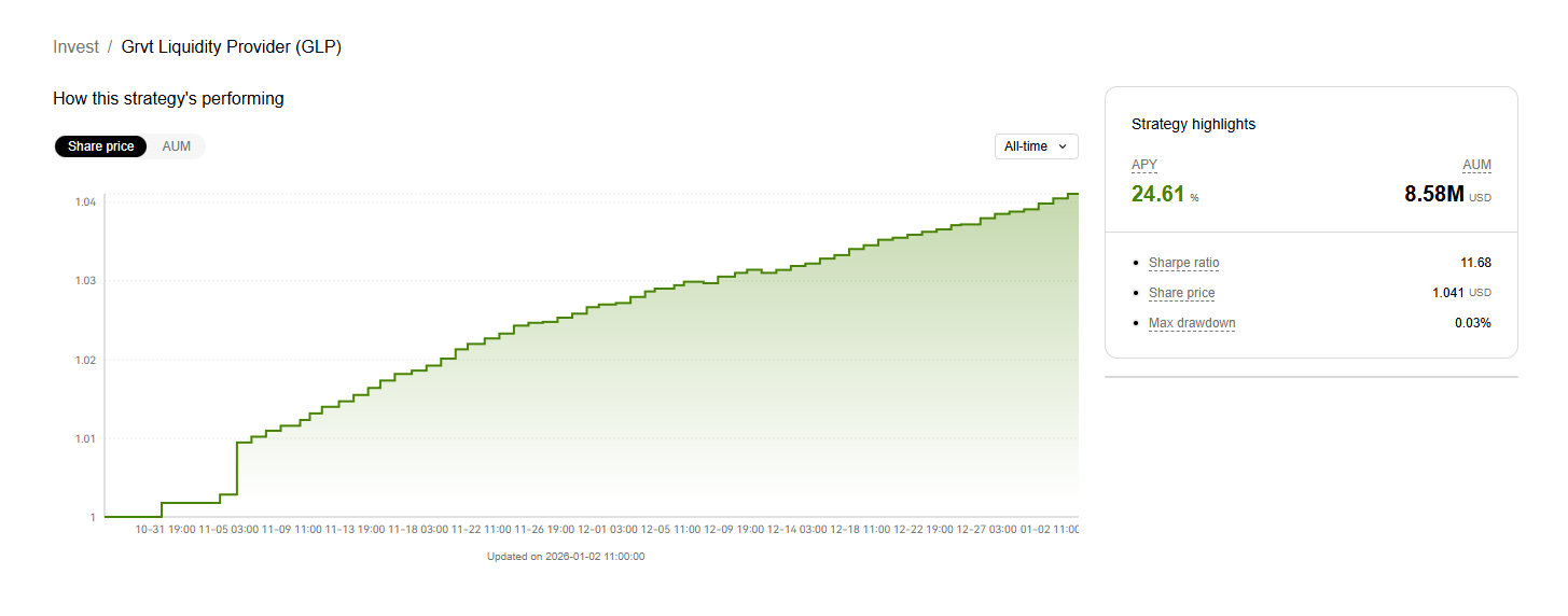 Là Market Maker thuộc sở hữu cộng đồng, GLP không thu Management Fee hay Performance Fee; 100% lợi suất được phân phối cho người gửi vốn. Kể từ khi ra mắt ngày 11/11/2025, GLP đã thu hút nhanh chóng, đạt 8,4 triệu USD AUM trong chưa đầy hai tháng. Tại thời điểm viết bài, Vault đạt APR 25,6% và Sharpe Ratio 11,4, phản ánh hiệu quả điều chỉnh rủi ro vượt trội.
