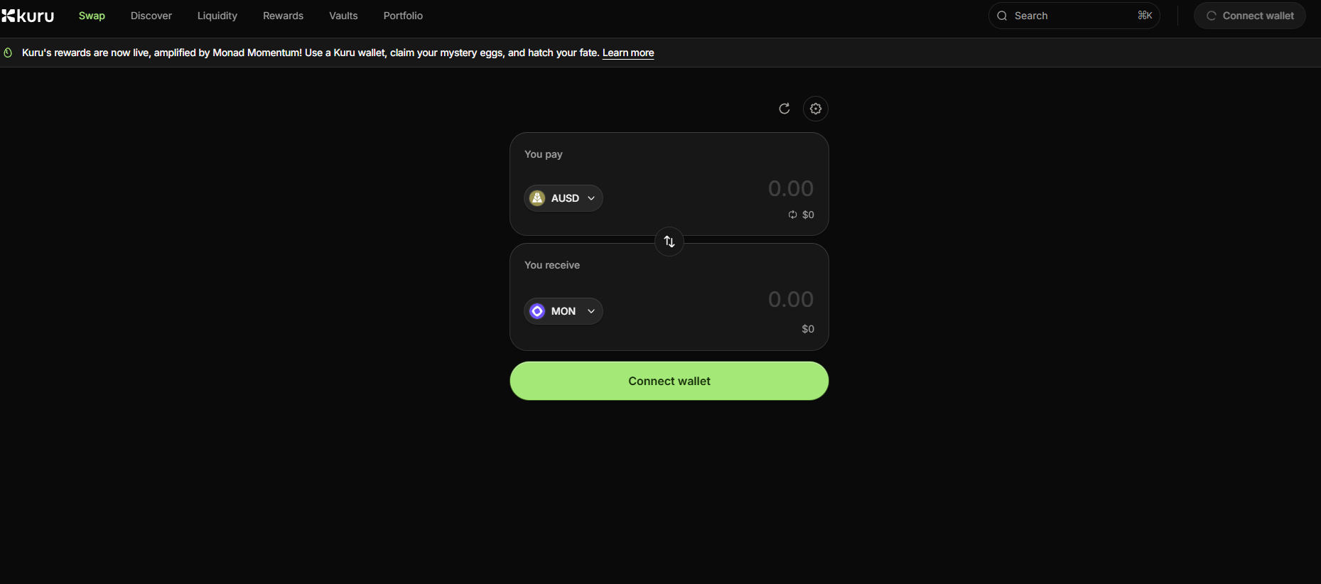 - Aggregator thông minh Kuru Flow: Hệ thống Routing tự động cho phép Swap Any-to-Any Token bằng cách truy cập thanh khoản từ tất cả các Market trên Monad, giúp người dùng đạt Route tối ưu, giảm Price Impact và dễ dàng tiếp cận toàn bộ Liquidity của hệ sinh thái chỉ qua một giao diện.