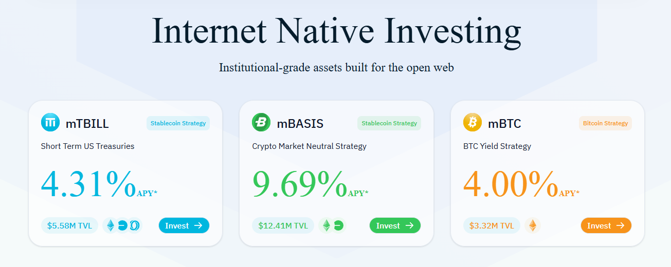 • Tài sản cấp tổ chức: Các sản phẩm như mTBILL và mBASIS sử dụng tài sản cấp tổ chức như trái phiếu chính phủ Mỹ ngắn hạn hoặc chiến lược Basis Trading để tạo lợi suất ổn định và an toàn.