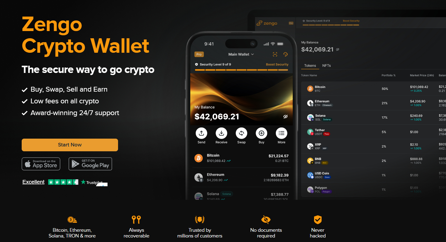 ZenGo nhấn mạnh tính tự quản lý, nghĩa là người dùng kiểm soát hoàn toàn tài sản mà không cần chia sẻ thông tin với bên thứ ba và chưa từng ghi nhận trường hợp ví bị hack nào trong lịch sử hoạt động. Ví hỗ trợ hơn 1.000 tài sản Crypto, bao gồm Bitcoin, Ethereum, Solana, TRON, Stablecoins như USDC và Tether, Memecoins như Dogecoin, Shiba Inu, Pepe, Floki, Bonk, Pengu, cũng như Stock Tokens và NFTs.